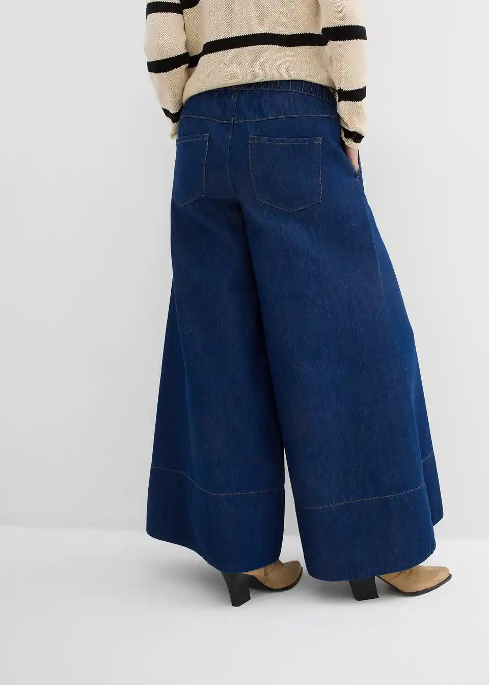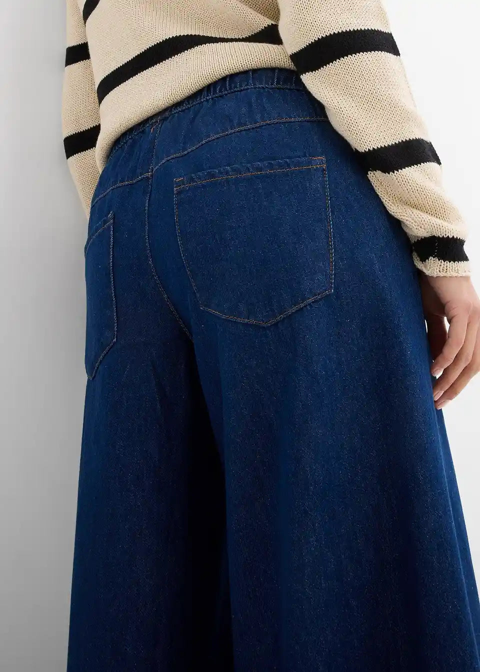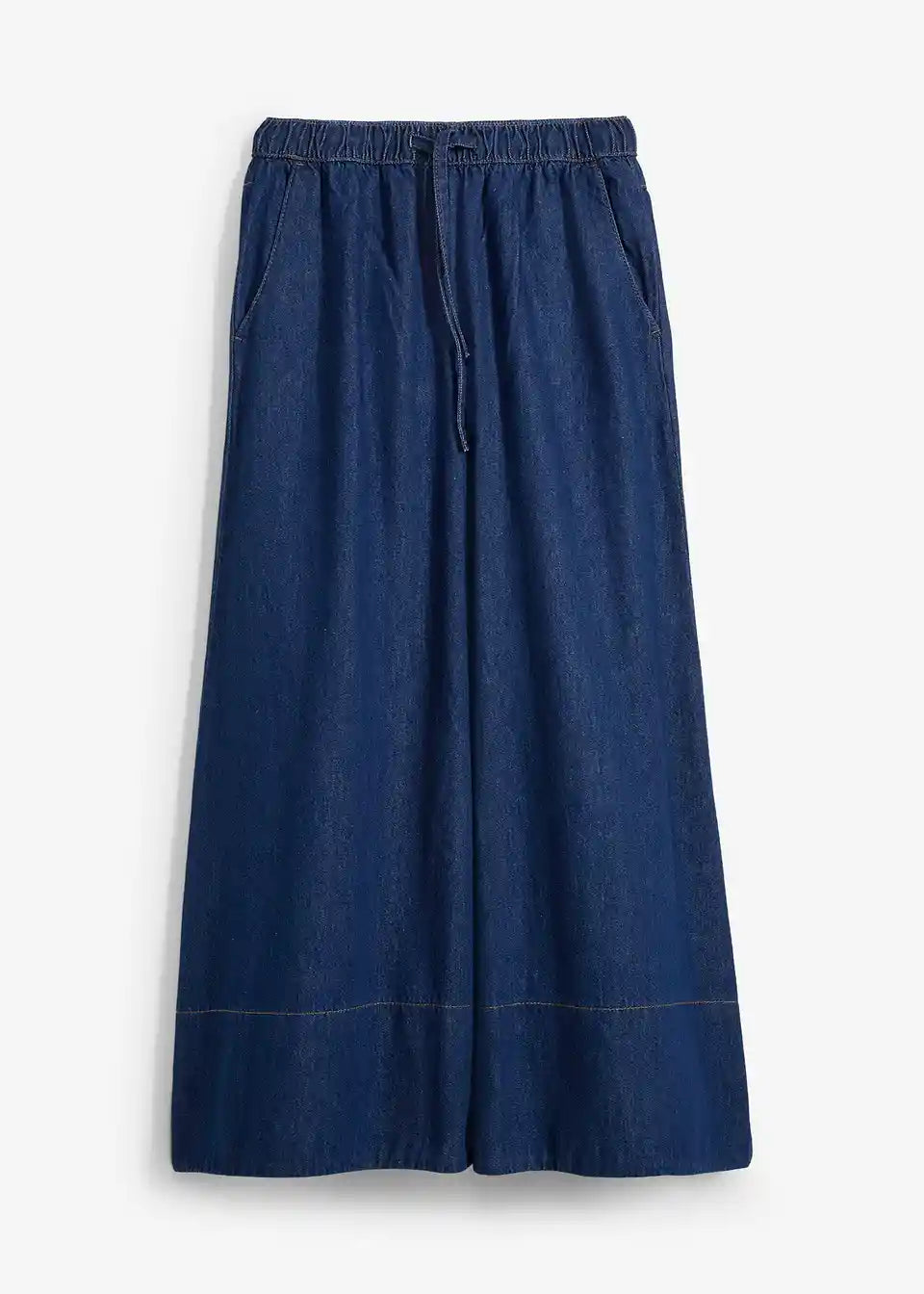 Široke 5-žepne jeans hlače z elastičnim udobnim pasom iz čvrstega bombažnega denima, ki je sprva nekoliko tog, z nošenjem pa postane mehkejši in bolj sproščen. Srednje visok pas in skrajšana dolžina. Dolžina notranjega šiva pri št. 42 pribl. 67,5 cm, primerno za strojno pranje.