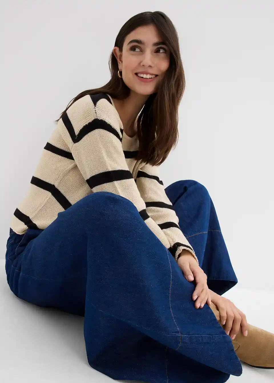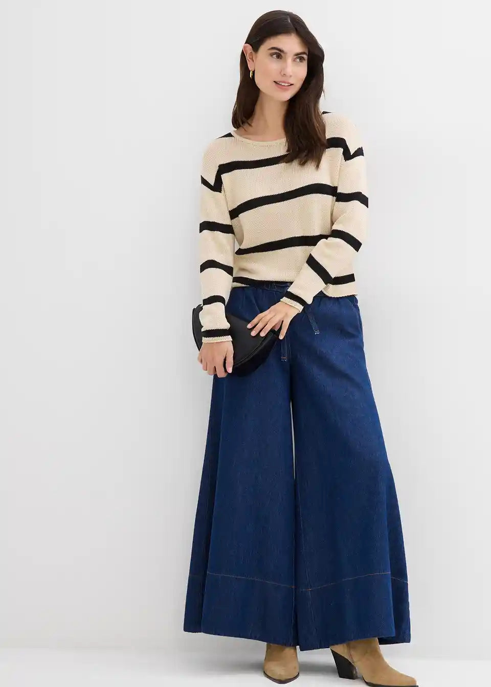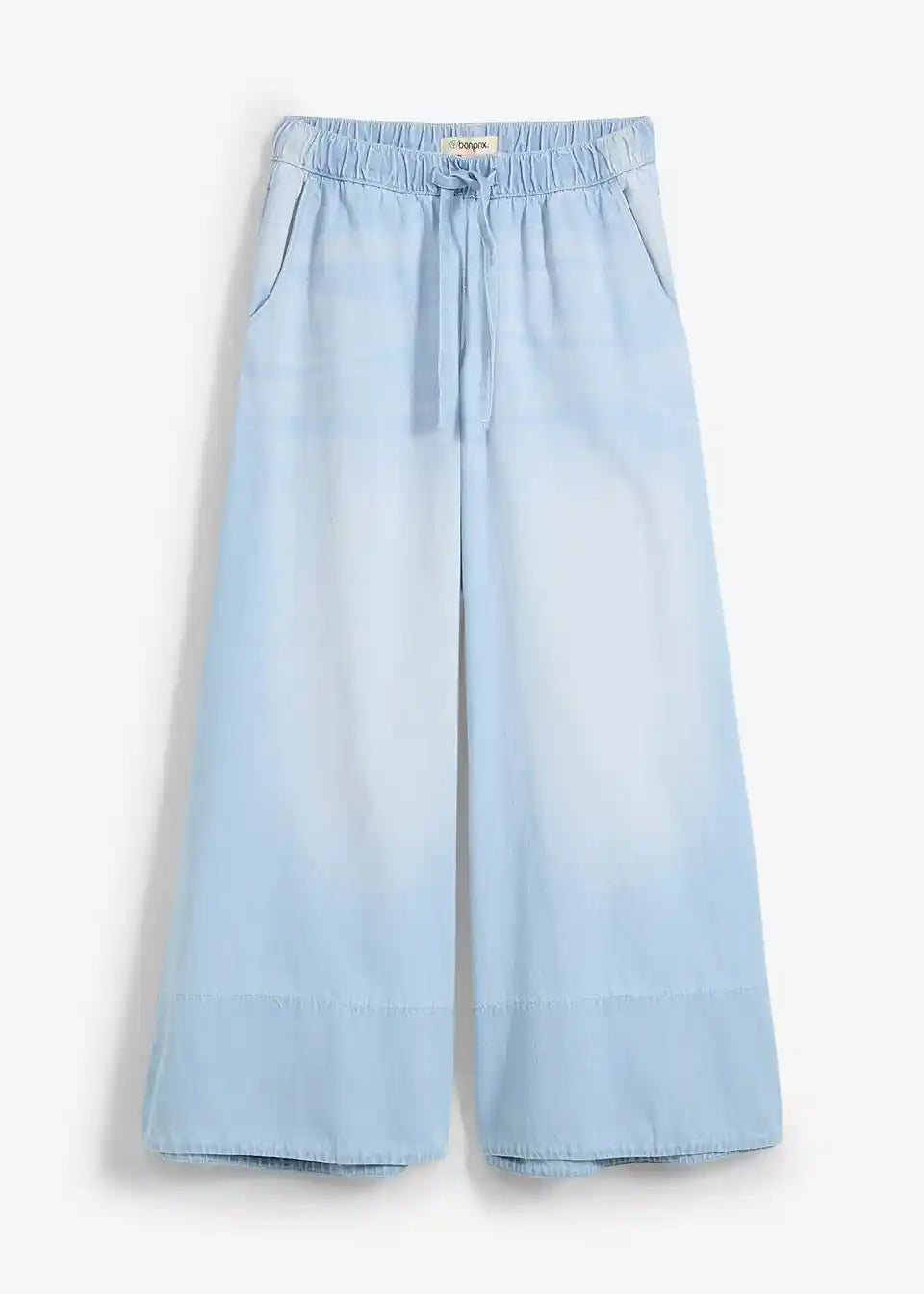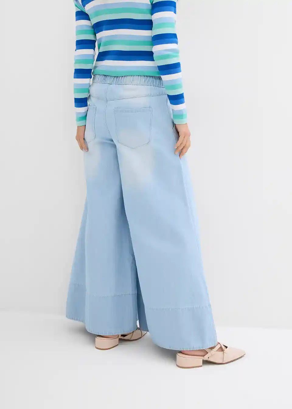 Široke 5-žepne jeans hlače z elastičnim udobnim pasom iz čvrstega bombažnega denima, ki je sprva nekoliko tog, z nošenjem pa postane mehkejši in bolj sproščen. Srednje visok pas in skrajšana dolžina. Dolžina notranjega šiva pri št. 42 pribl. 67,5 cm, primerno za strojno pranje.