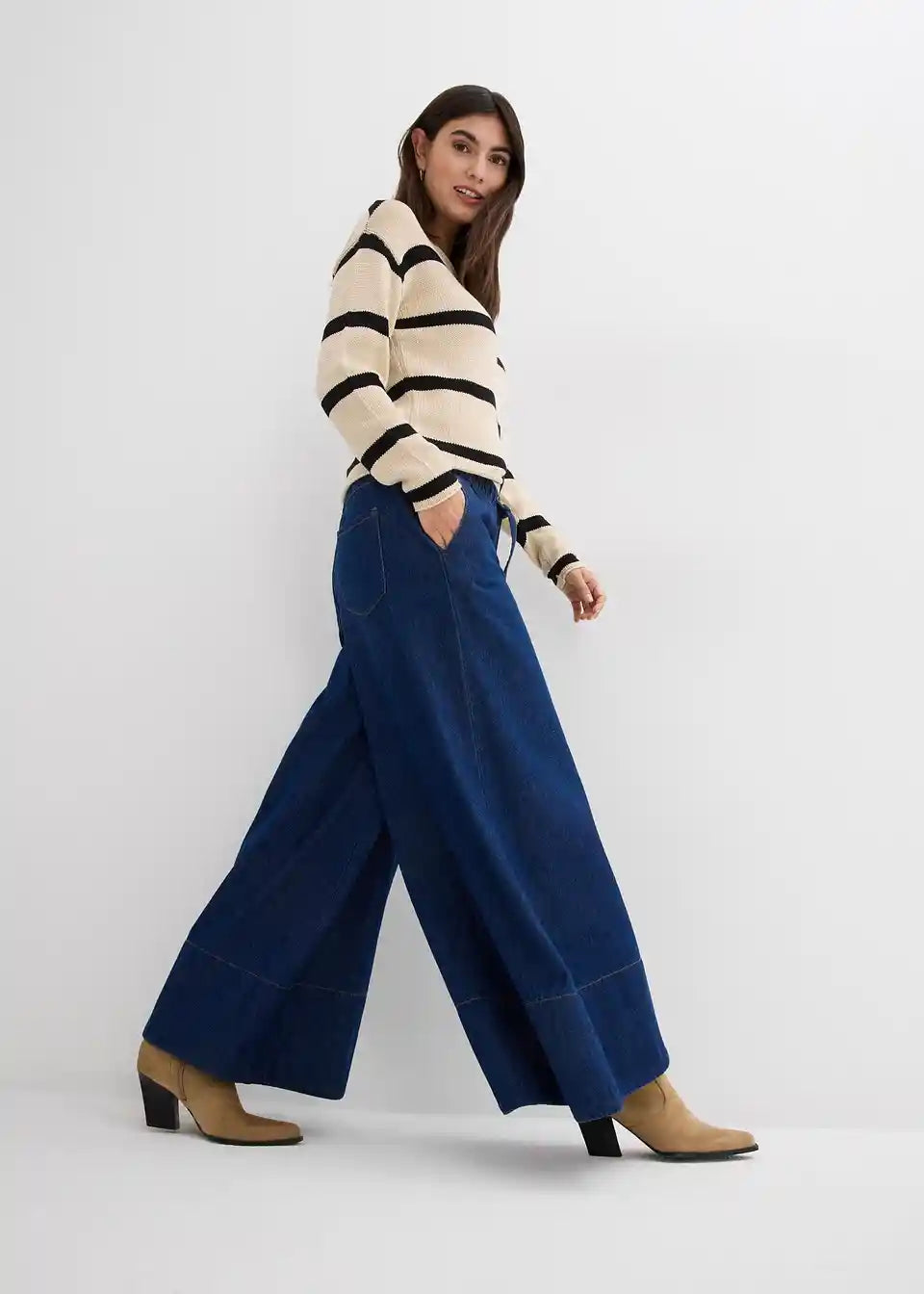 Kavbojke s širokimi hlačnicami in srednje visokim udobnim pasom