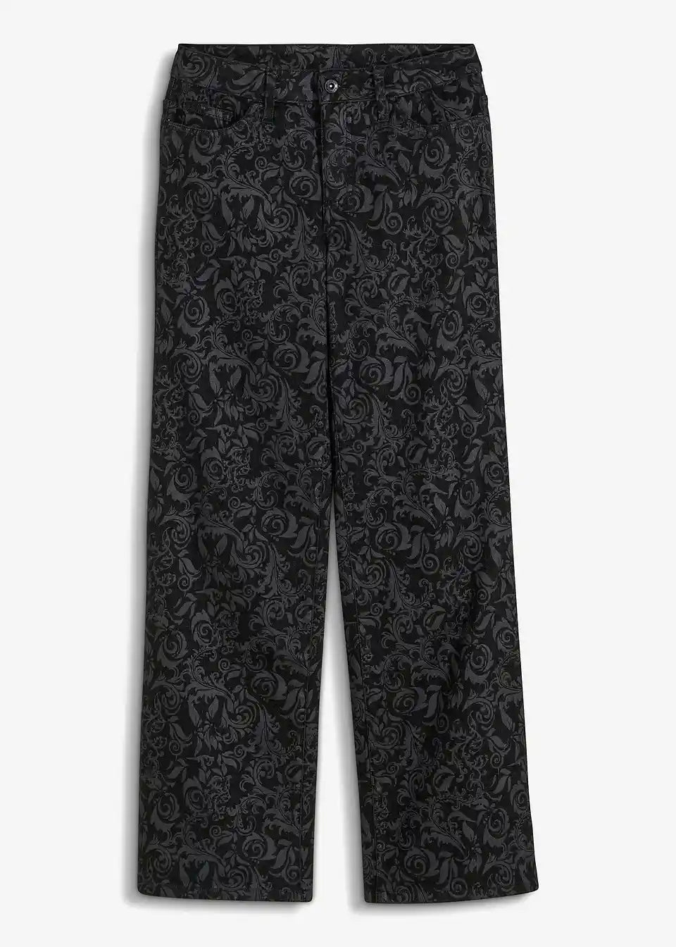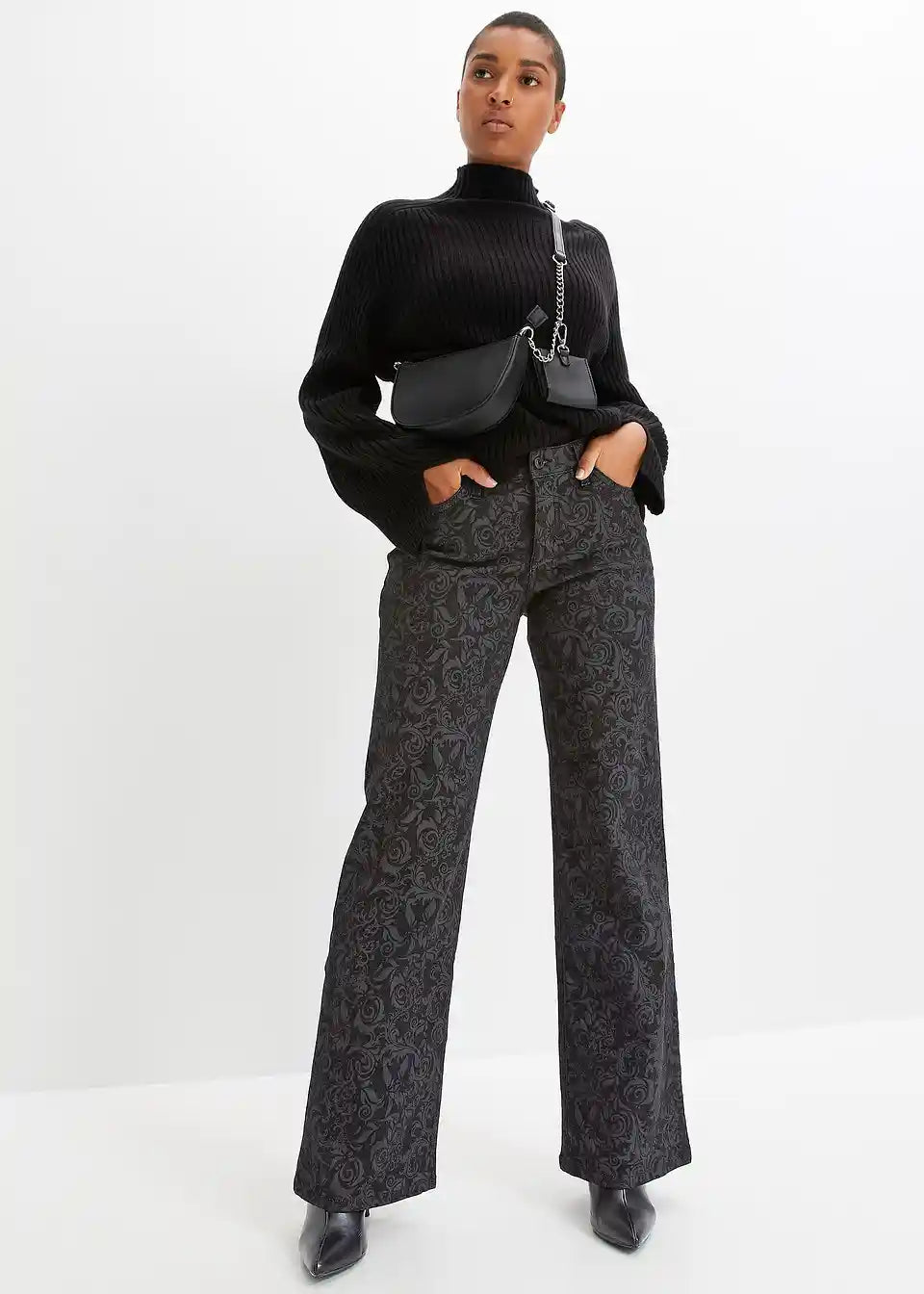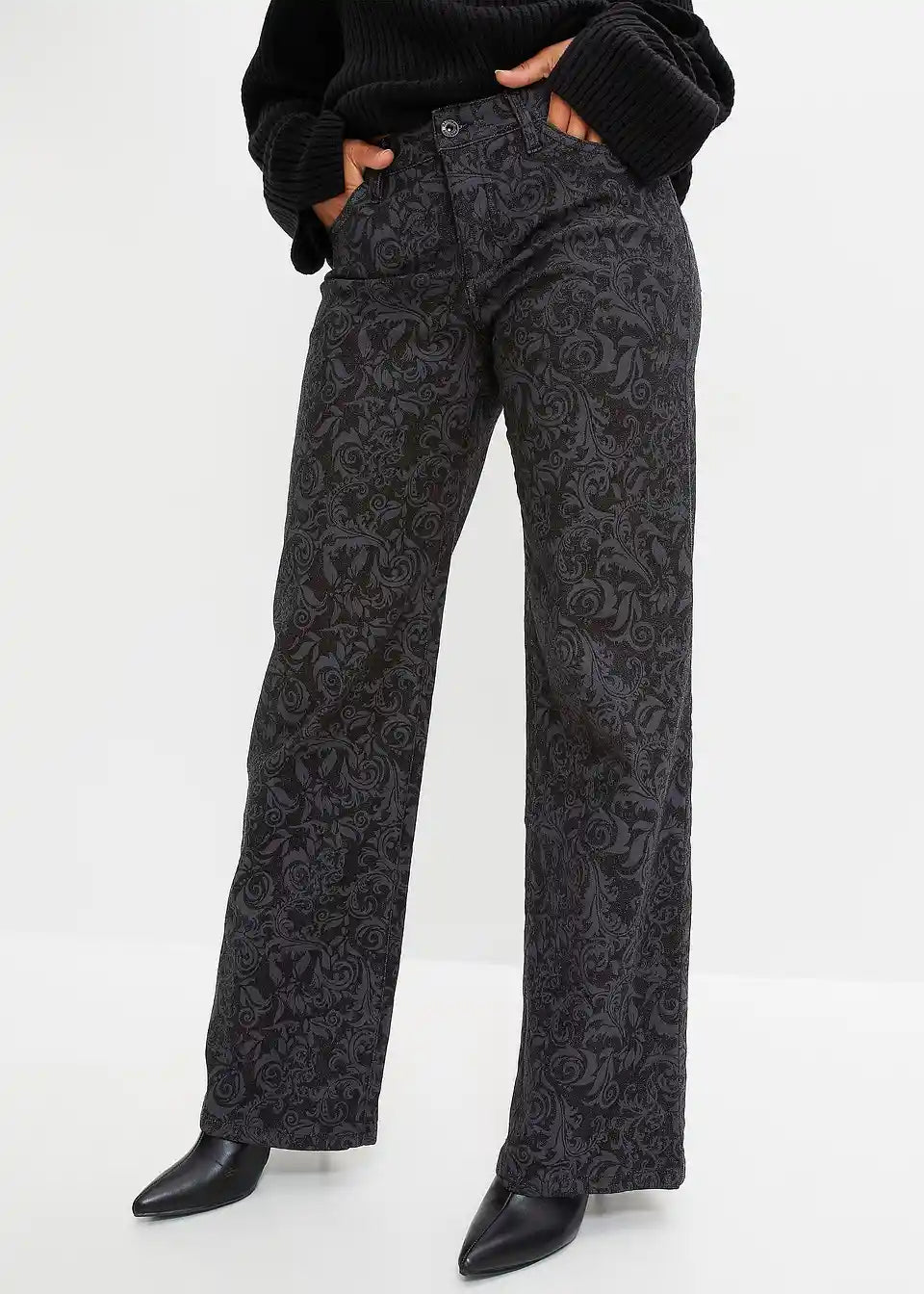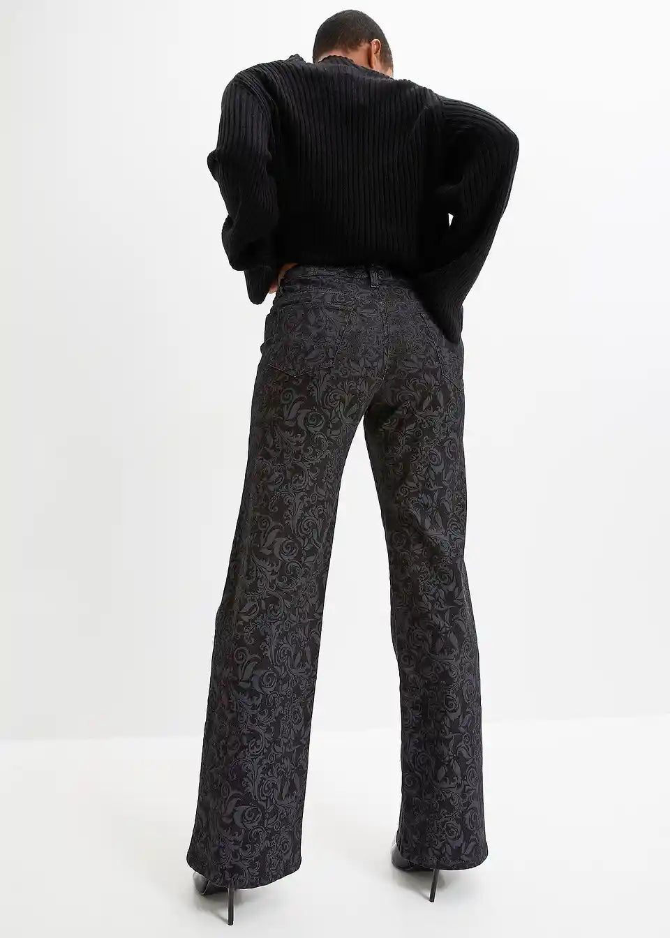 Kavbojke s širokimi hlačnicami, srednje visokim pasom in sijočim vzorcem