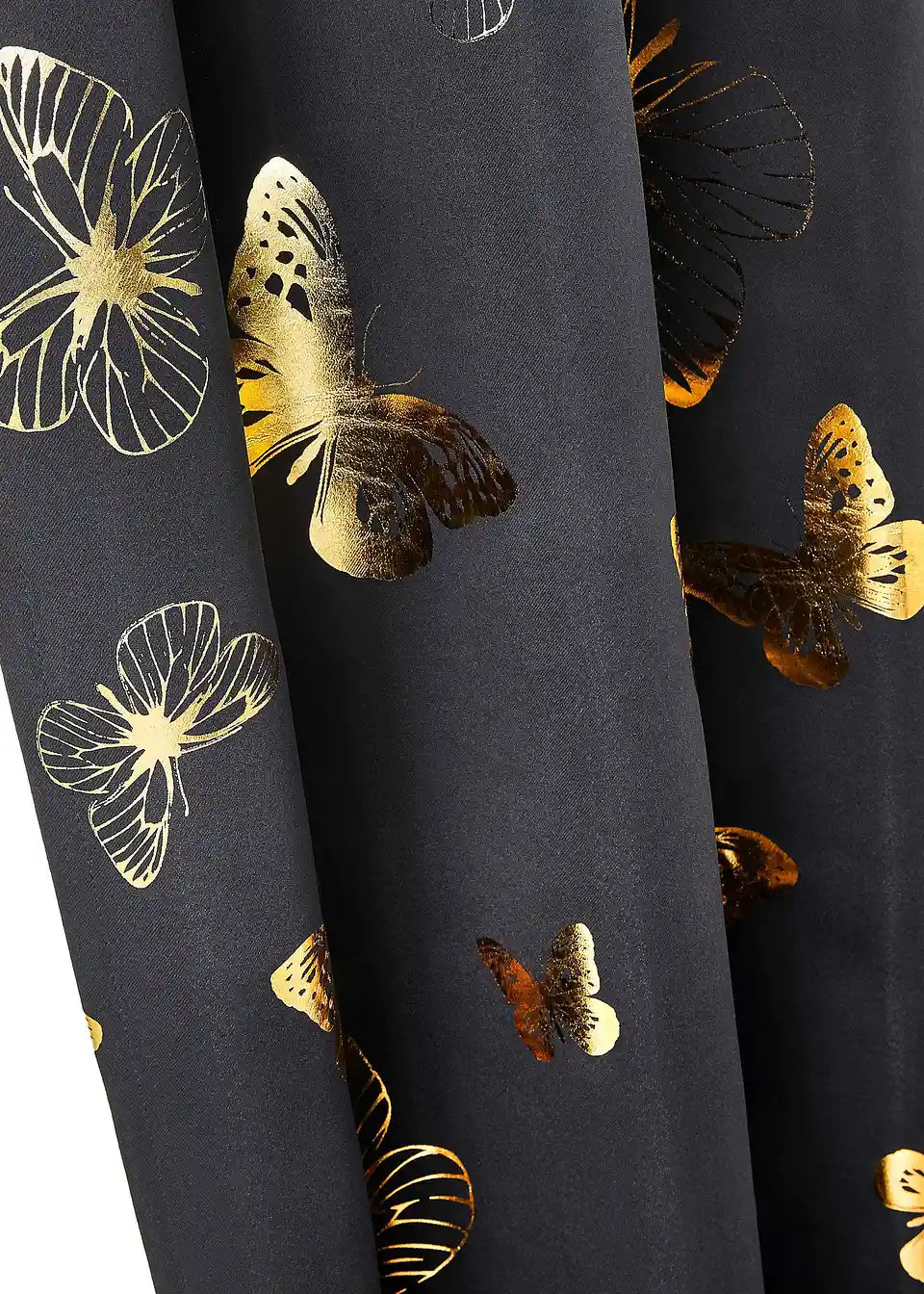 Zavesa iz težke tkanine, potiskana z bleščečimi metulji. Pravi okras za vaš dom! Idealna za spalnico, saj tkanina zatemni prostor. Zavesa ima lahko zvočno absorpcijski in toplotno izolacijski učinek, kar pomeni, da duši hrup in varčuje z energijo, saj preprečuje vdor hladnega zraka.