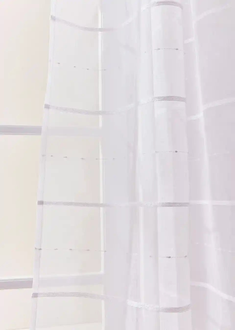 Prosojna že pripravljena zavesa z diskretnimi črtami v 3D izgledu. Zavesa v beli barvi se odlično kombinira in je vsestransko uporabna.