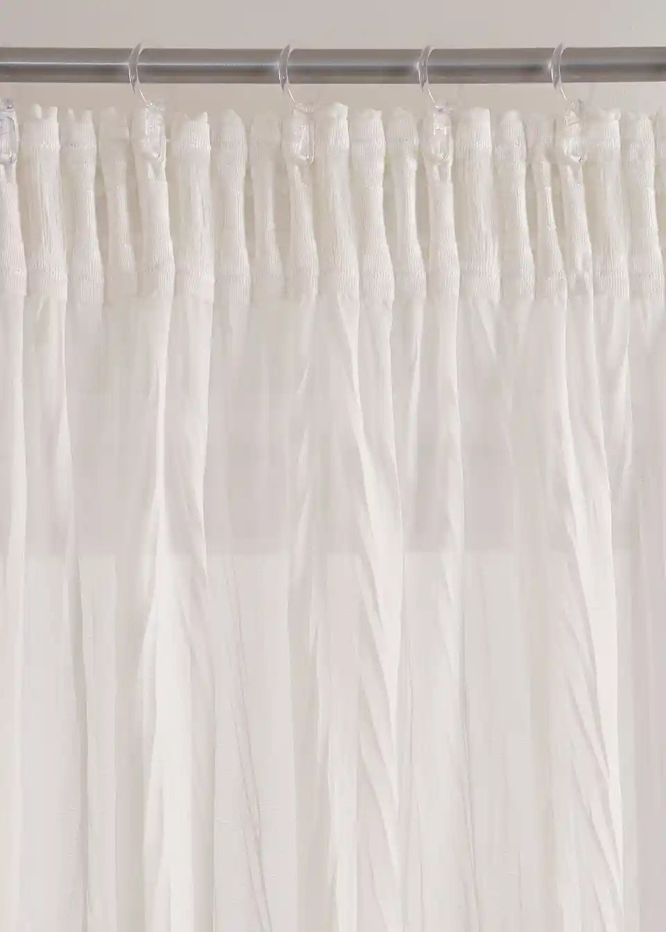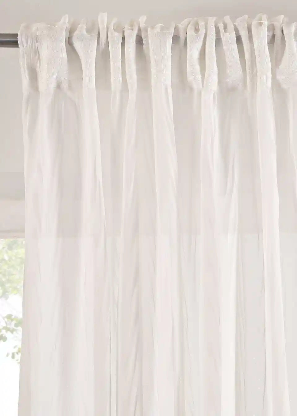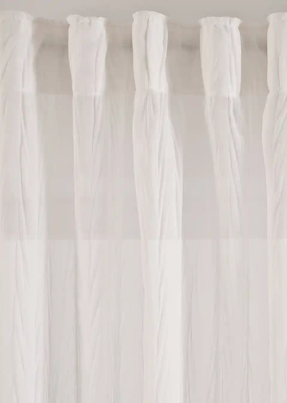 Moderna polprosojna zavesa z lepim barvnim prelivom. Še ena posebnost je Crushed videz, torej izrazito zmečkan videz. Likanje tukaj zagotovo ni potrebno.